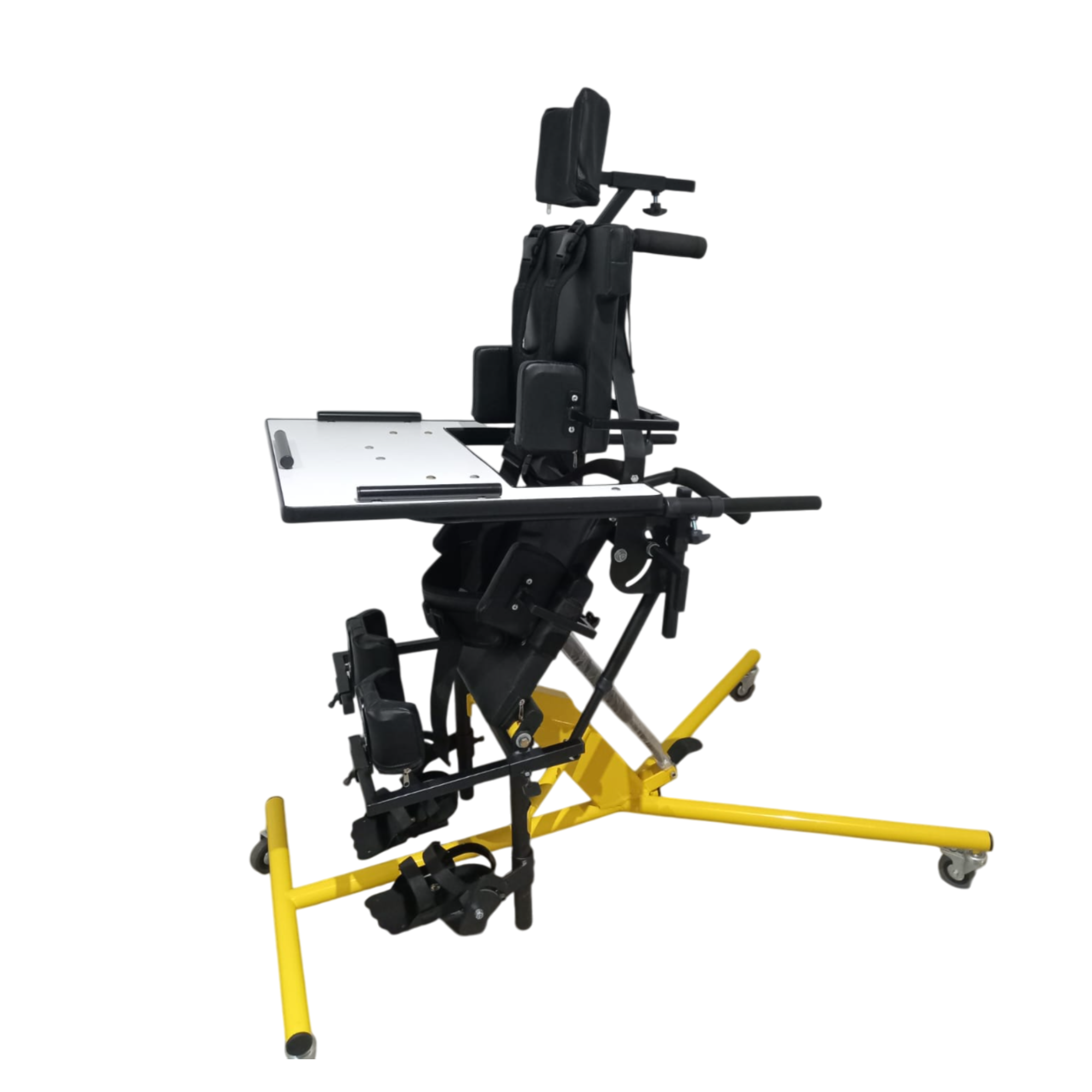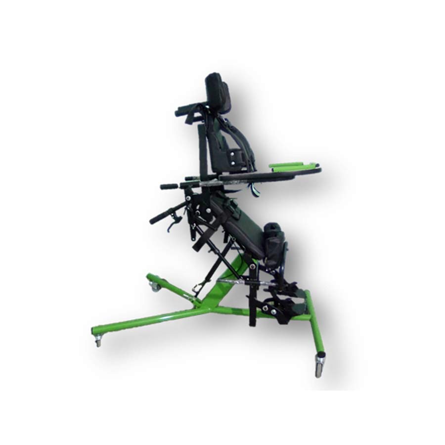 Estructura fabricada en acero con terminaciones en pintura poliuretanica de alta resistencia. 4 ruedas de 80mm 2 con freno. Parado progresivo. Dispositivo indicador para medir rango articular. Pistón hidráulico compulsado. Mesa de madera rebatible con bordes de contención para evitar caída de objetos. Rodilleras regulables en profundidad. Respaldo y asiento anatómico con fundas en cuerina. Posición sentado a parado a 90°. Posición supino. Pechera mariposa pivofit. Apoya cabeza. Cinturón pélvico de ajuste central de 2 puntos. Apoya pies independientes regulables en profundidad, altura, flexión dorsal y plantar. Accionador de supinación.