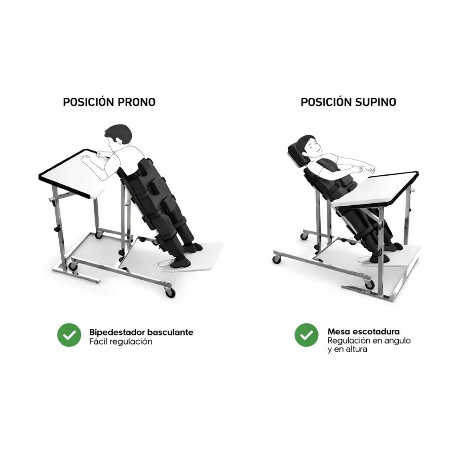 Fabricada en acero y madera. Terminaciones en pintura en polvo de alta resistencia. 4 ruedas, 2 con freno. Regulable en inclinación de 25° a 90° por medio de pistón neumático o por sistema manual. Base de apoya pies multiajustable con taloneras de sujecion. Rodilleras con faja de contención. Placa de cadera y tronco, regulables en profundidad, altura y ancho. Mesa con estructura independiente regulable en altura , profundidad e inclinación.